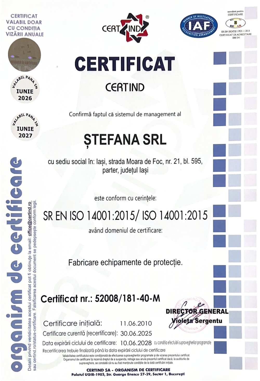 ISO 14001 certifică faptul că ȘTEFANA respectă și aplică bune practici de mediu în toate activitățile sale. Aceasta include utilizarea responsabilă a resurselor, reducerea deșeurilor,